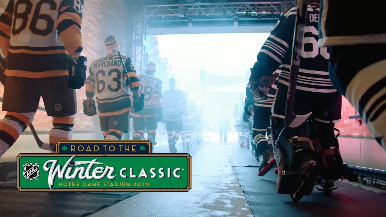 The period ending culminates with the Bruins and Blackhawks skating outdoors at Notre Dame Arena in the 2019 Bridgestone NHL Winter Standard